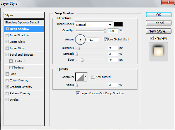 Tulis teks 'Happy New Year 2013' lalu klik ganda layer teks berikn Drop Shadow dan Gradient Overlay seperti pada gambar.